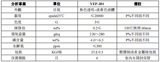 YEP-301系列(lie)系無溶劑、低(dī)粘度、高磷含(hán)量含磷液態(tài)環氧樹脂,和一般環(huan)氧樹脂類似(si),適合配(pèi)合各種各類(lei)的環氧樹脂(zhi)固化劑、促進(jìn)劑、填料(不推(tui)薦碳酸鹽類(lèi))、輔料以及各(gè)種溫度下的(de)固化反應,製(zhì)造各種各類(lei)的無鹵阻燃(ran)環氧樹脂產(chǎn)品。